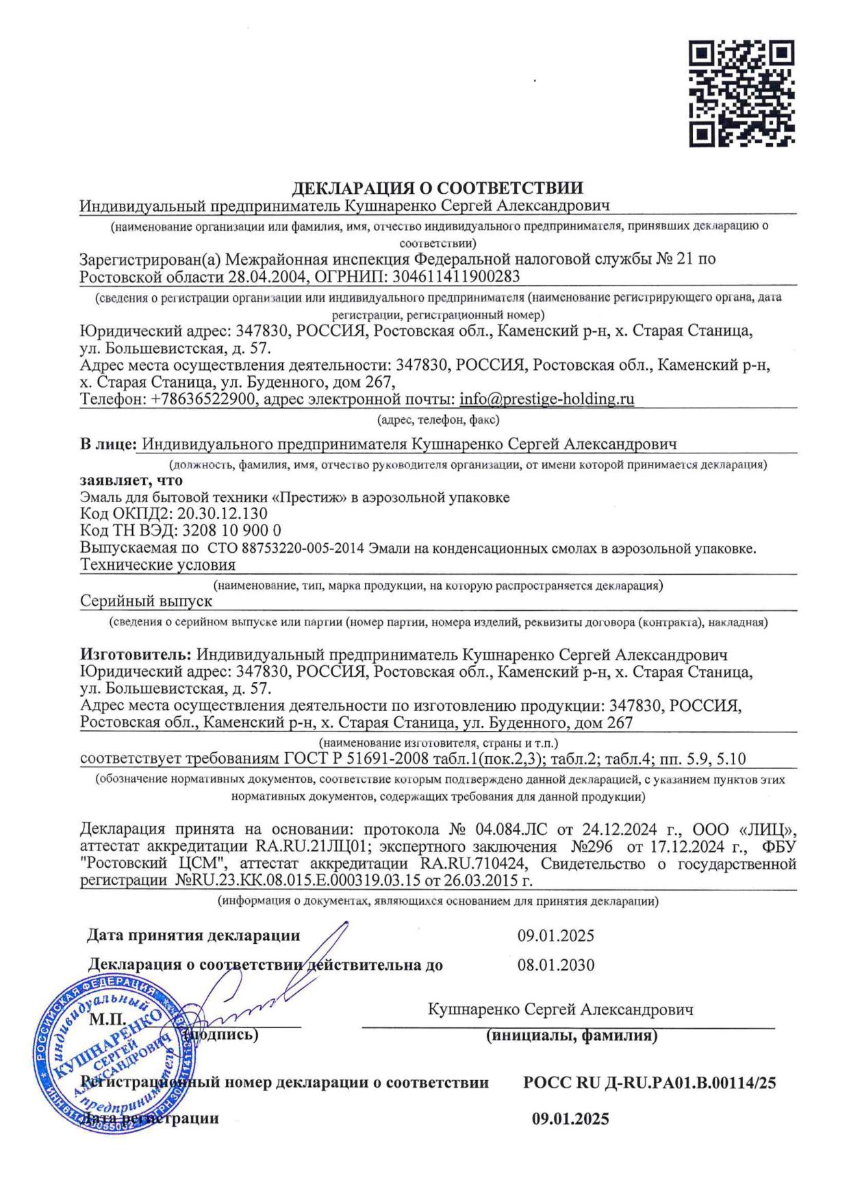 Аэрозольная эмаль для бытовой техники ПРЕСТИЖ белая 520мл