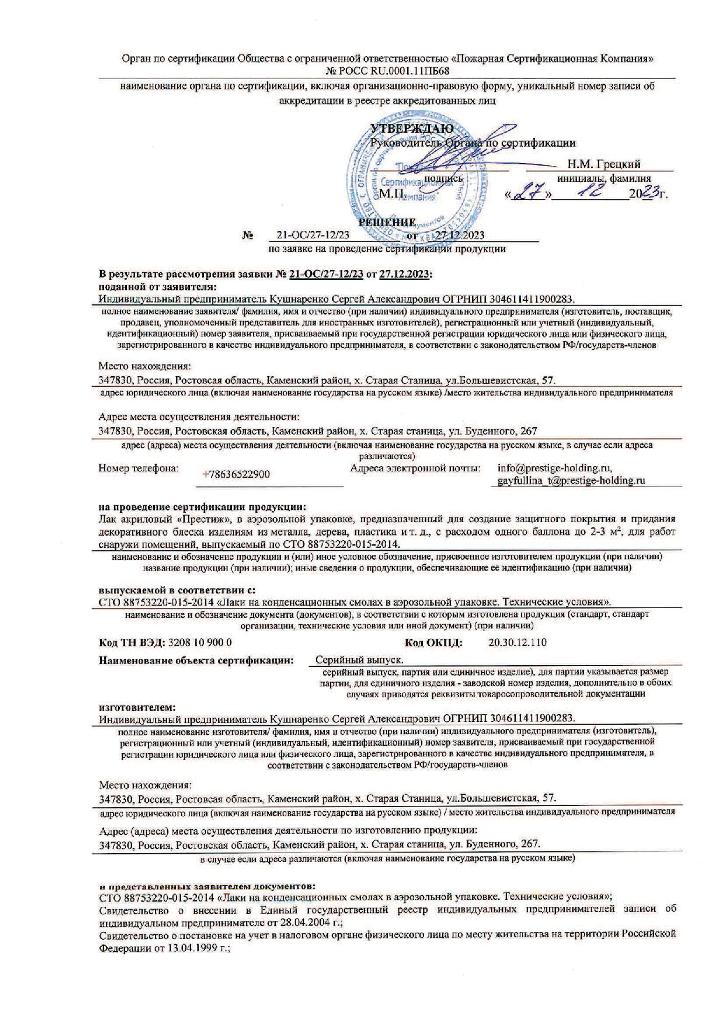 Аэрозольный лак акриловый ПРЕСТИЖ матовый 520мл