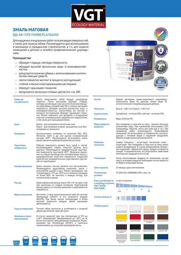Эмаль акриловая ВД-АК-1179 VGT матовая база С 2,5кг