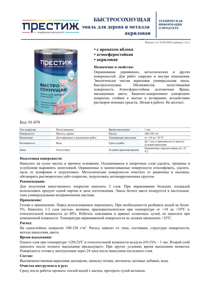 Окрашивание деревянных, металлических и других поверхностей. Для работ снаружи и внутри помещения. Экологически чистая акриловая универсальная эмаль. Быстросохнущая. Шелковистая, полуглянцевая поверхность. Атмосферостойкая, долговечная. Яркие, насыщенные цвета. Защитно-декоративное однородное покрытие, стойкое к мытью и истиранию, воздействию растворов моющих средств. Лёгкая в работе. Не желтеет..