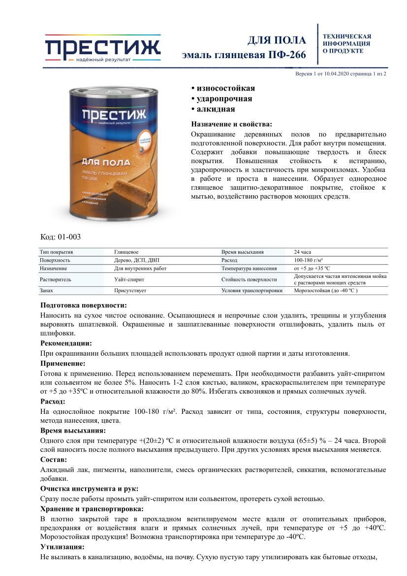 Эмаль для пола ПФ-266 ПРЕСТИЖ золотисто-коричневая 0,9кг
