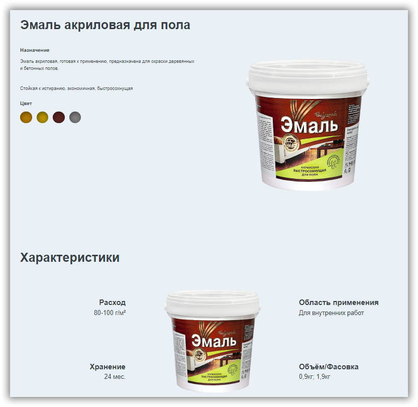 Свойства и особенности: легко наносится, быстро сохнет, экологически чистая, не имеет резкого запаха. Образует долговечное покрытие. После высыхания образует гладкую, полуглянцевую поверхность. Отличительной особенностью покрытия является грязе-