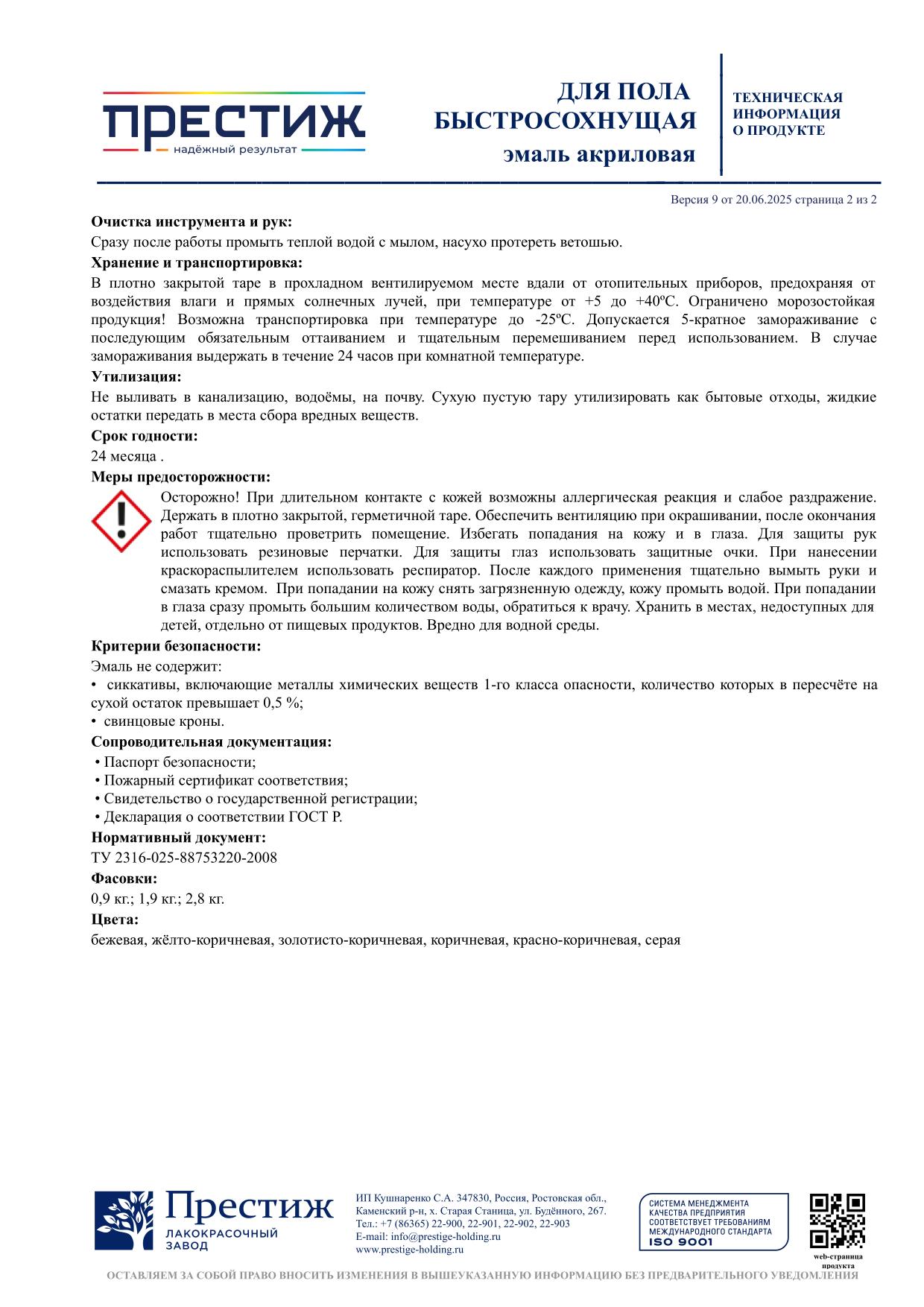 Эмаль для пола акриловая быстросохнущая ПРЕСТИЖ серая 0,9кг