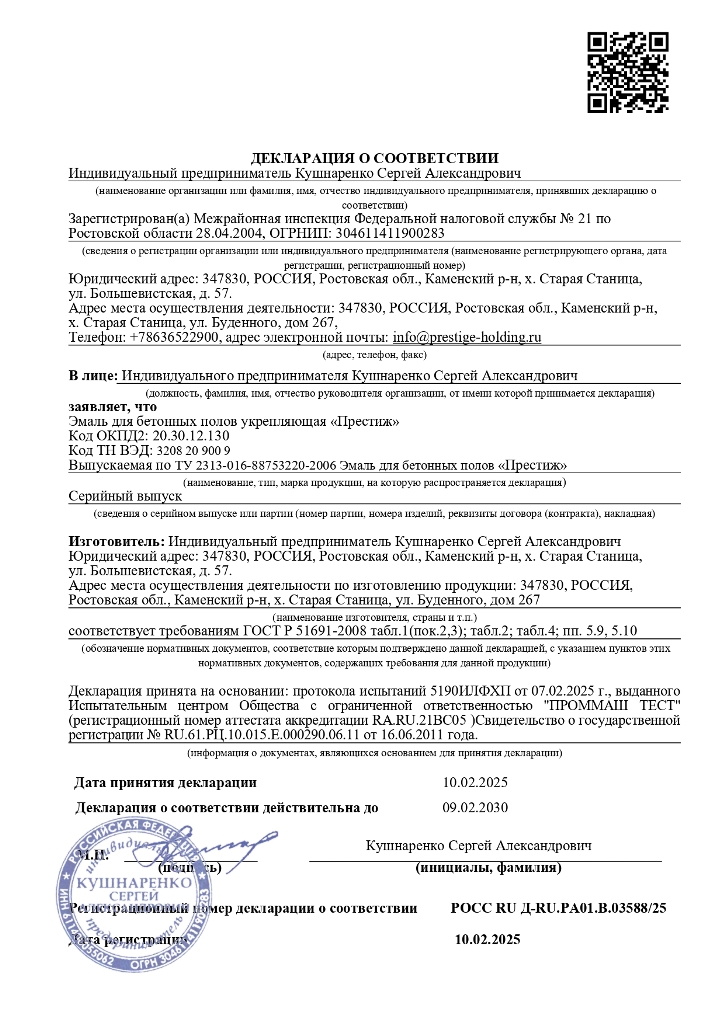 Эмаль для бетонных полов укрепляющая ПРЕСТИЖ серая 6кг