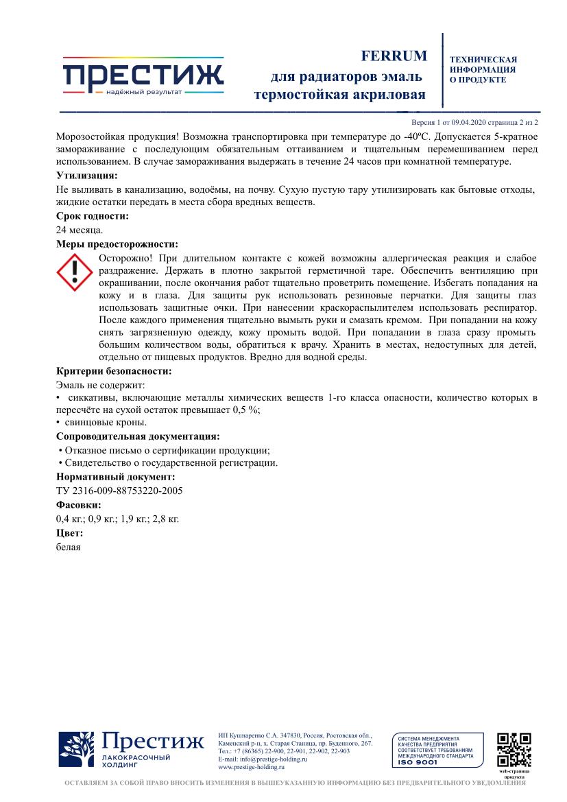 Эмаль для радиаторов акриловая термостойкая ПРЕСТИЖ белая 0,4кг