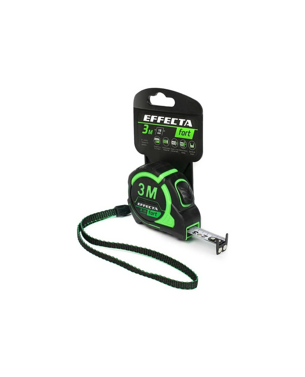 Рулетка Effecta Fort 3м/16мм, магнит, автостоп, лента-2сторонняя шкала нейлон
