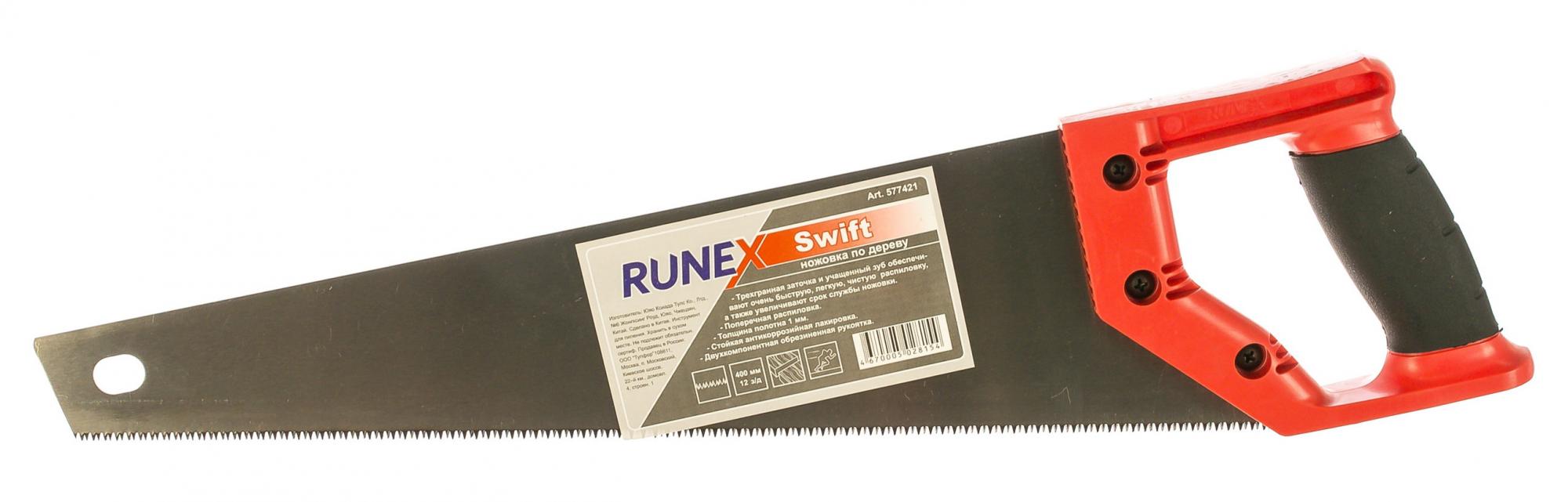 Ножовка по дереву 400мм 3-гр заточка, 12з/д закал, быстрый чистый распил 2-комп рук. "Runex Swift"