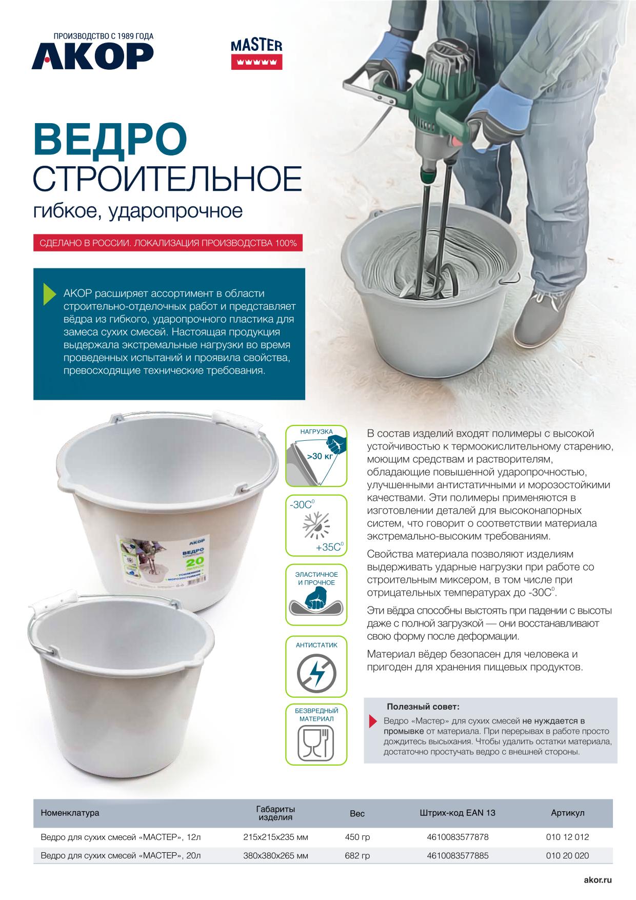 Полезный совет: Ведро «Мастер» для сухих смесей не нуждается в промывке от материала. При перерывах в работе просто дождитесь высыхания. Чтобы удалить остатки материала, достаточно простучать ведро с внешней стороны.