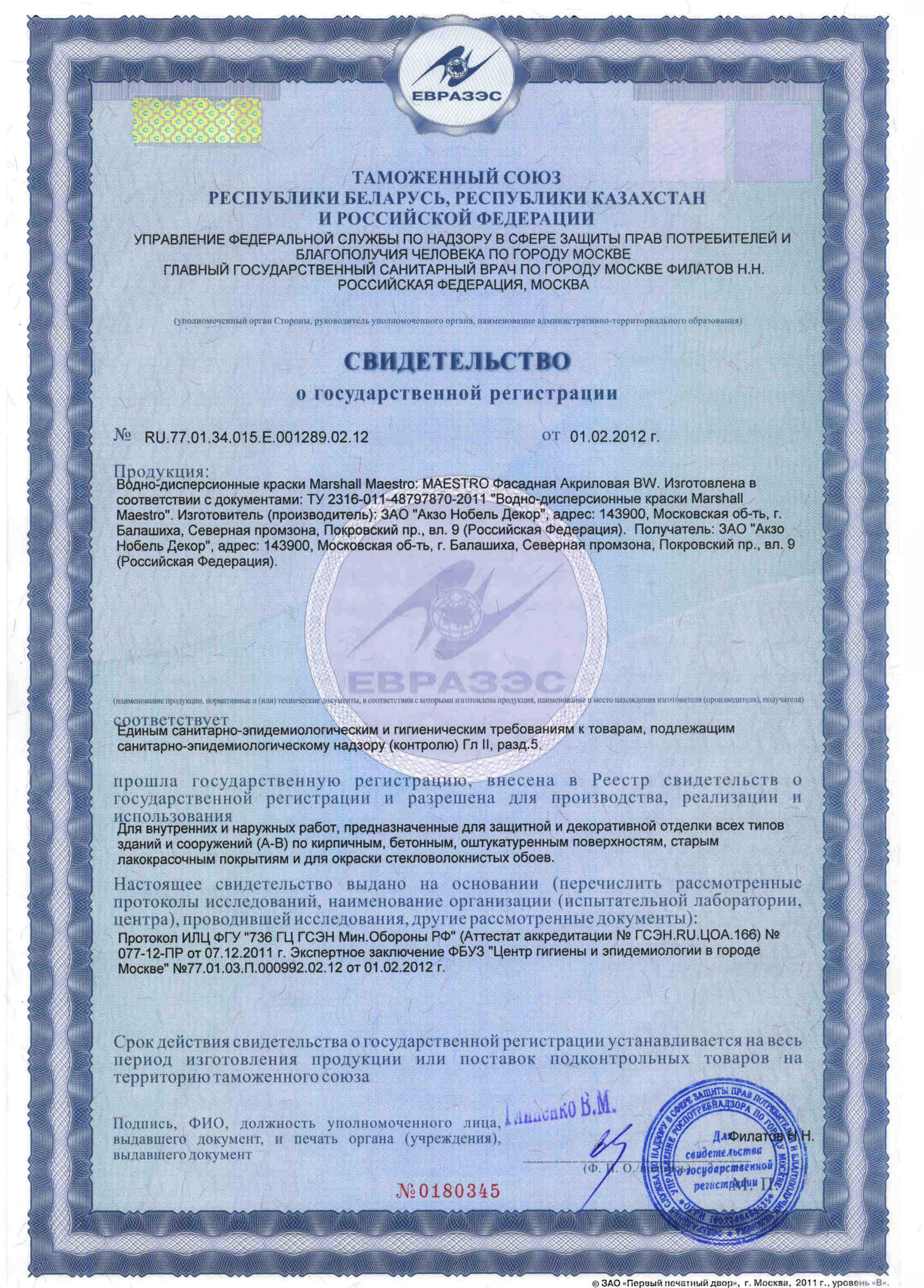 Добавить поверхностьПеред применением разбавить в рекомендованной пропорции водой и тщательно перемешать. Произвести подготовку поверхности. Рекомендуется наносить в два слоя при температуре от +5 °C до +30 °С, относительной влажности воздуха от 40 до 80 %. Для защиты фасада от грибка и плесени, укрепления базовой поверхности, а также уменьшения расхода краски загрунтуйте подготовленную поверхность фасадной грунтовкой глубокого проникновения Marshall Maestro. Заданный уровень атмосферостойкости покрытие достигает через 10–12 дней после окрашивания.
