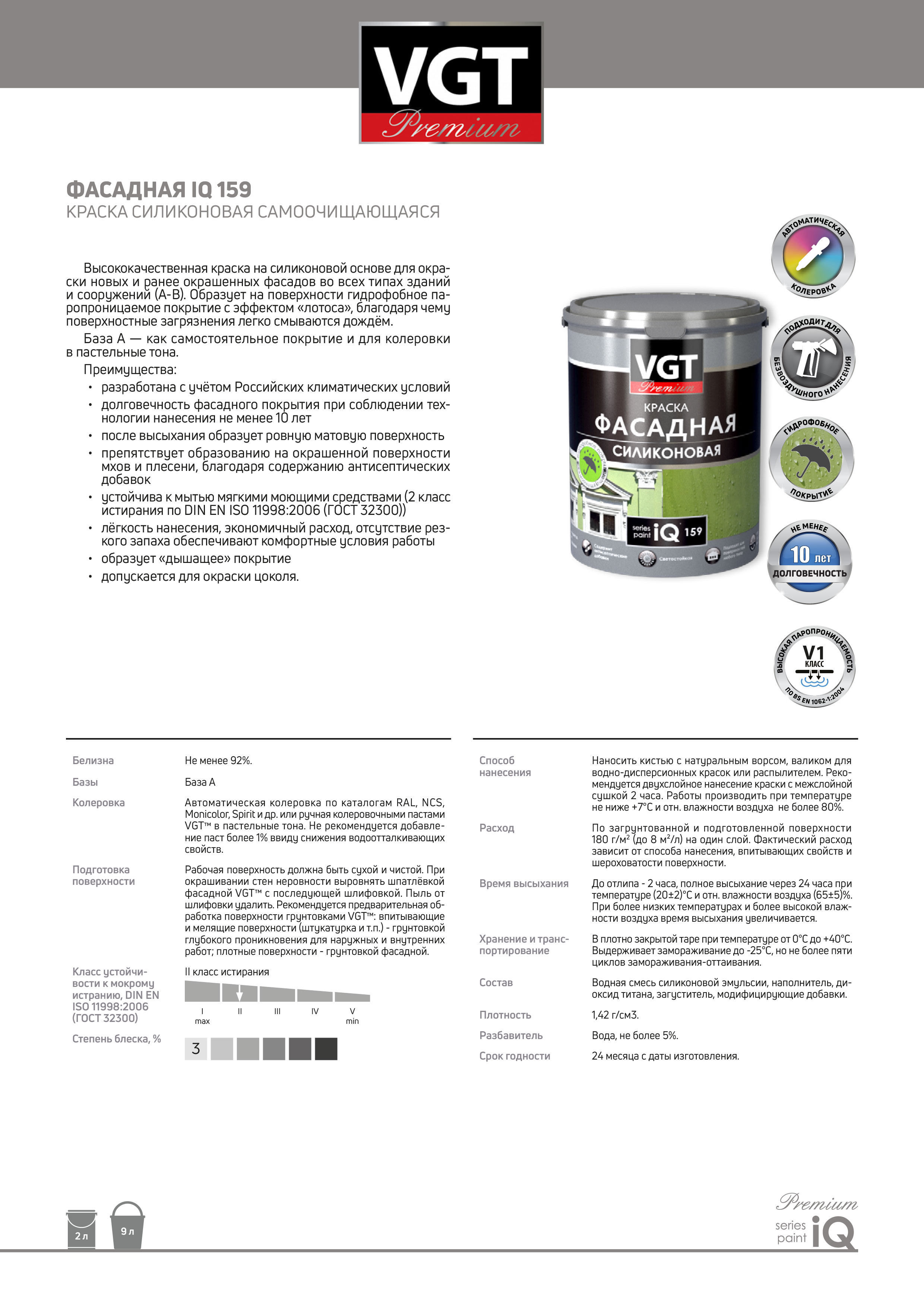 Краска VGT PREMIUM фасадная IQ 159 база А силикон самоочищающаяся 2л (2,9кг)