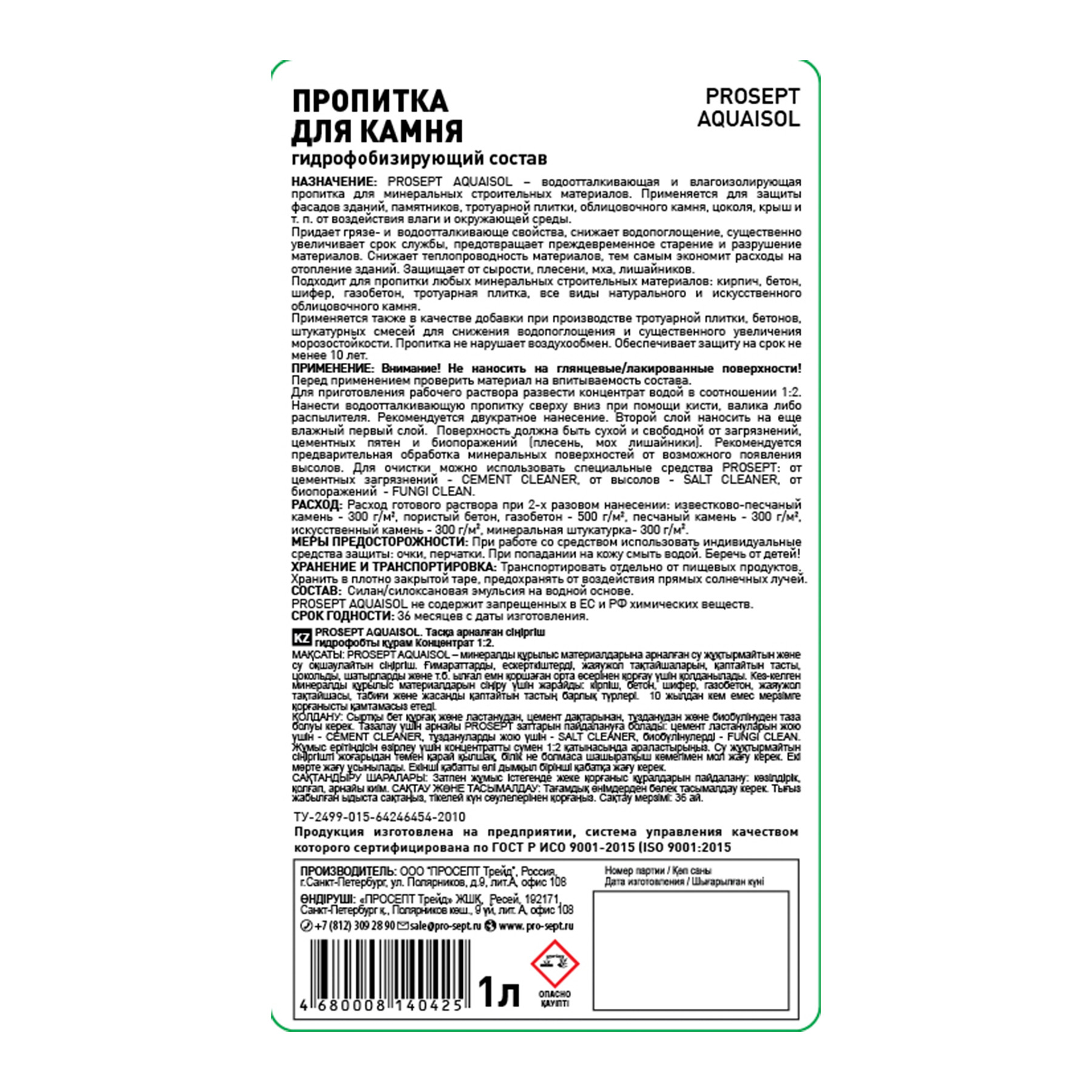Просепт AQUAISOL пропитка для камня, гидрофобизирующий состав 1:2, 1л (неморозостойкий)