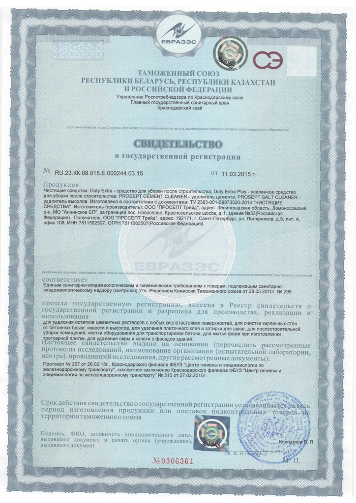 Цементный налет, раствор для затирки швов: развести водой в соотношении 1:2-1:5.Остатки извести, водоэмульсионных красок: развести водой в соотношении 1:5-1:10.Послестроительная уборка: развести водой и моющим средством в соотношении 1:10.