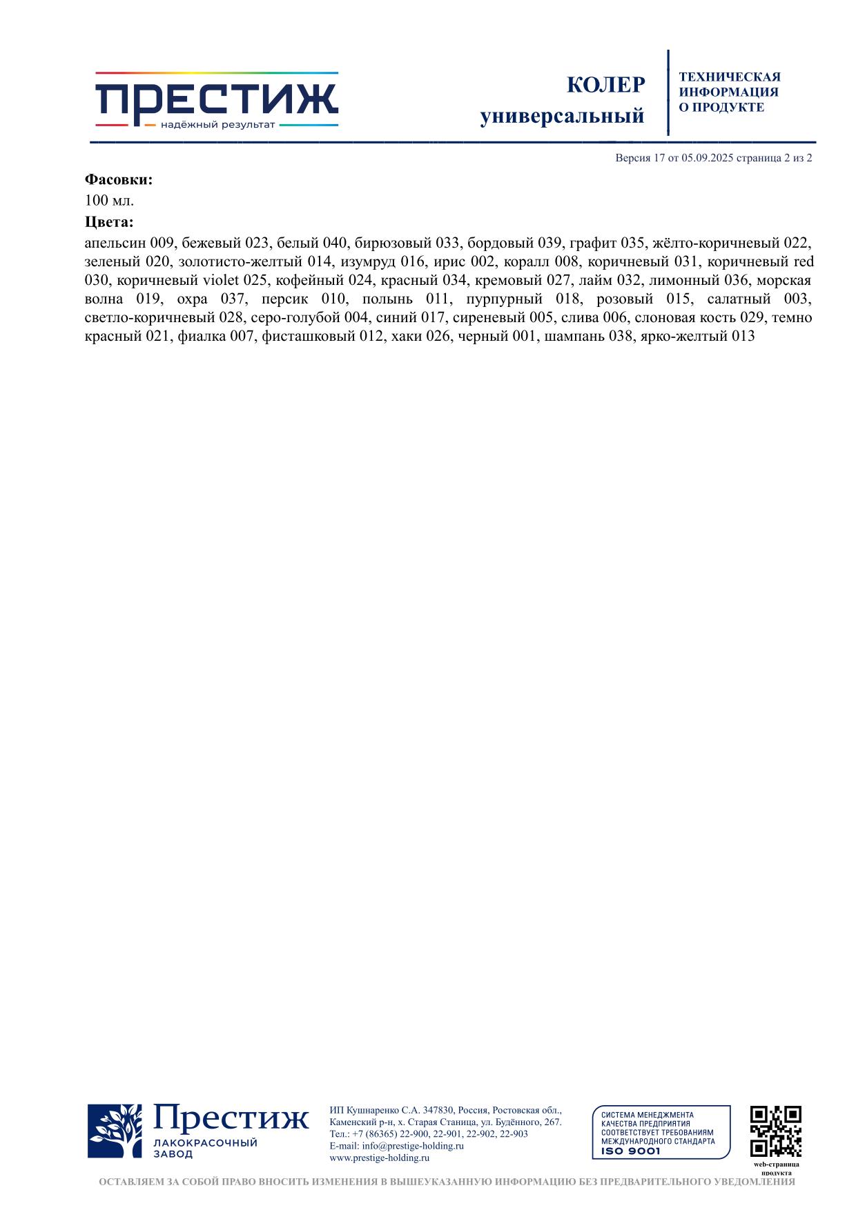 №024 Колер ПРЕСТИЖ универсальный 0,1л кофейный