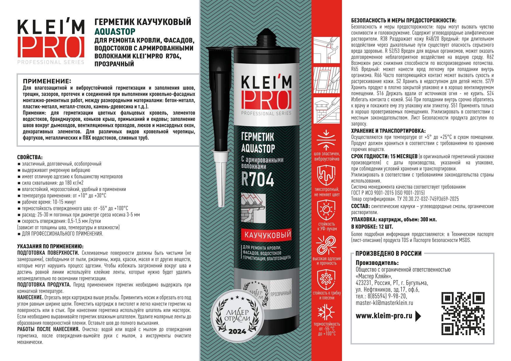Герметик каучуковый для кровли, фасадов, водостоков KLEI`MPRO AQUASTOP R704 прозрачный 300мл