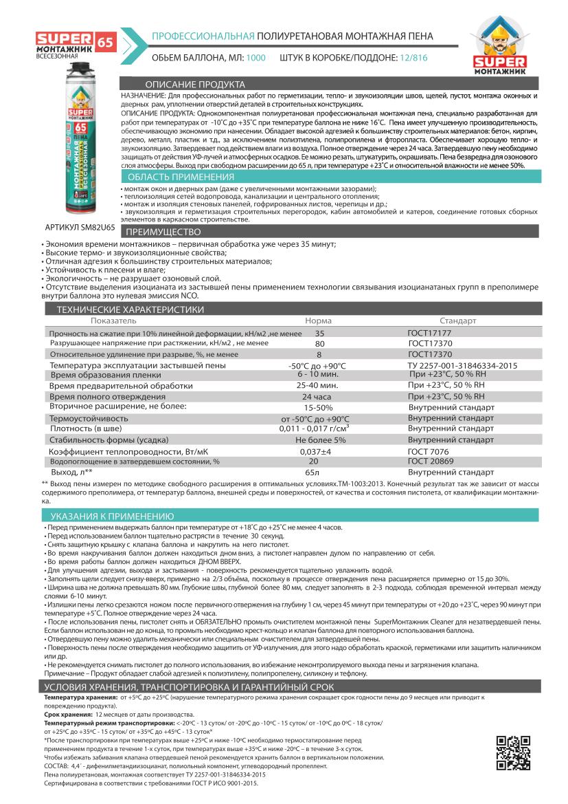 Пена профессиональная SUPER МОНТАЖНИК 65 монтажная всесезонная 780г