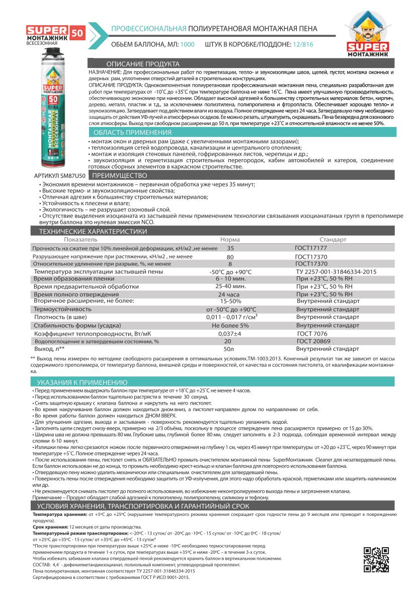 Однокомпонентная полиуретановая профессиональная монтажная пена, специально разработанная для работ при температурах от -10˚С до +35˚С при температуре баллона не ниже 16˚С. Пена имеет улучшенную производительность, обеспечивающую экономию при нанесении. Обладает высокой адгезией к большинству строительных материалов: бетон, кирпич, дерево, металл, пластик и т.д., за исключением полиэтилена, полипропилена и фторопласта. Обеспечивает хорошую тепло- и звукоизоляцию. Затвердевает под действием влаги из воздуха. Полное отверждение через 24 часа. Затвердевшую пену необходимо защищать от действия УФ-лучей и атмосферных осадков. Ее можно резать, штукатурить, окрашивать. Пена безвредна для озонового слоя атмосферы. Выход при свободном расширении до 50 л, при температуре +23˚С и относительной влажности не менее 50%.