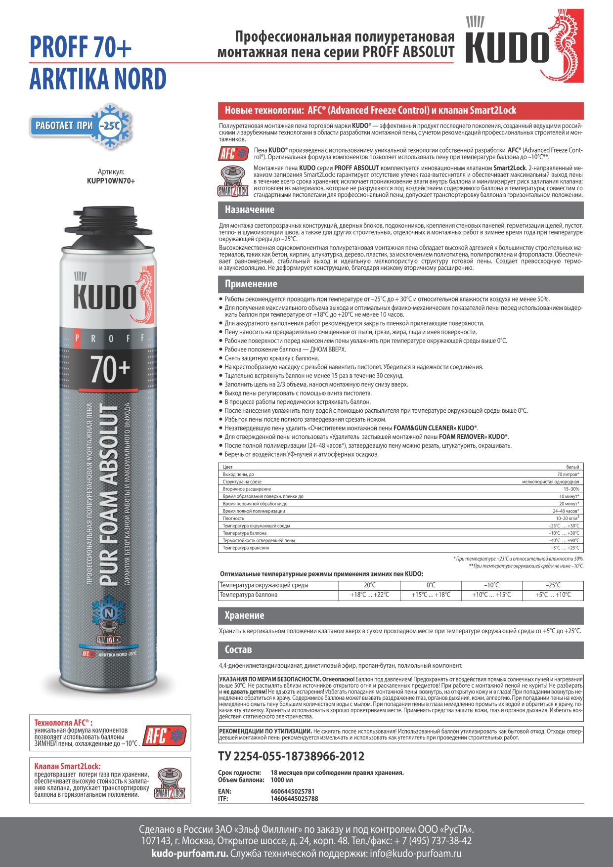 Высококачественная однокомпонентная полиуретановая зимняя монтажная пена KUDO® PROFF 70+ ARKTIKA NORD обладает высокой адгезией к большинству строительных материалов, таких как: бетон, кирпич, штукатурка, дерево, пластик, за исключением полиэтилена, полипропилена и фторопласта.