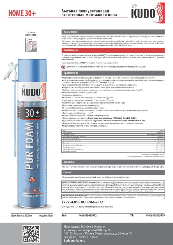Высококачественная однокомпонентная полиуретановая всесезонная монтажная пена KUDO® HOME 30+ обладает высокой адгезией к большинству строительных материалов, таких как: бетон, кирпич, штукатурка, дерево, пластик, за исключением полиэтилена, полипропилена и фторопласта.