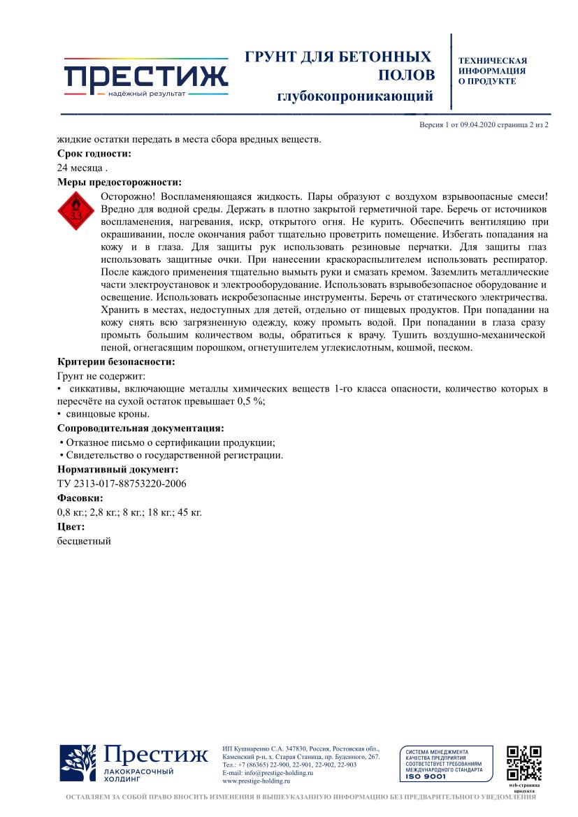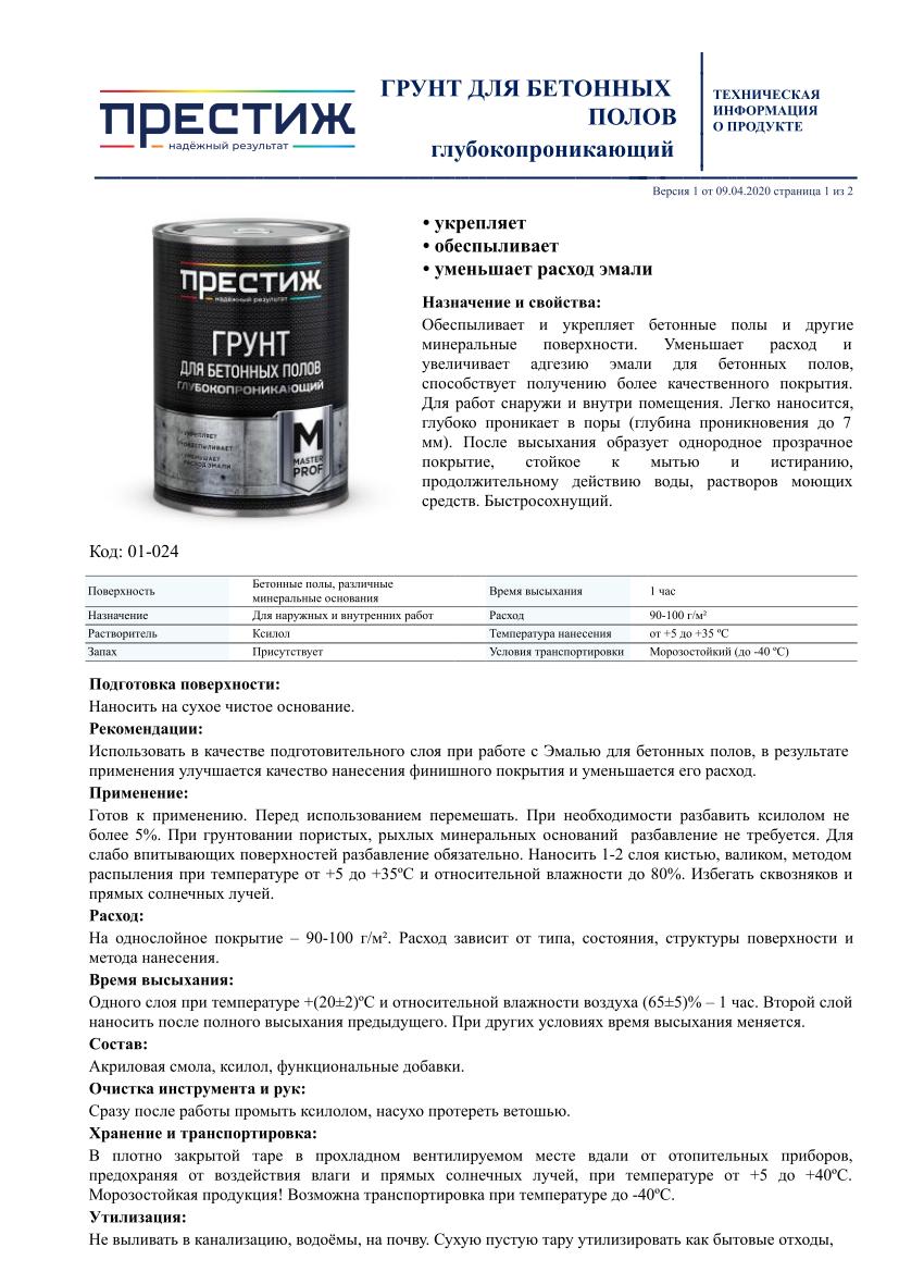 Обеспыливает и укрепляет бетонные полы и другие минеральные поверхности. Уменьшает расход и увеличивает адгезию эмали для бетонных полов, способствует получению более качественного покрытия. Для работ снаружи и внутри помещения. Легко наносится, глубоко проникает в поры (глубина проникновения до 7 мм). После высыхания образует однородное прозрачное покрытие, стойкое к мытью и истиранию, продолжительному воздействию воды, растворов моющих средств. Быстросохнущий.