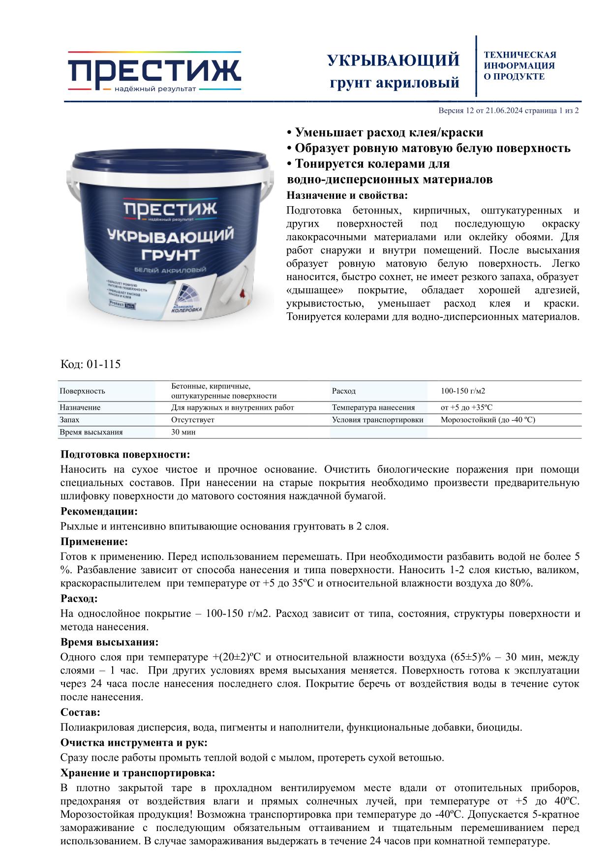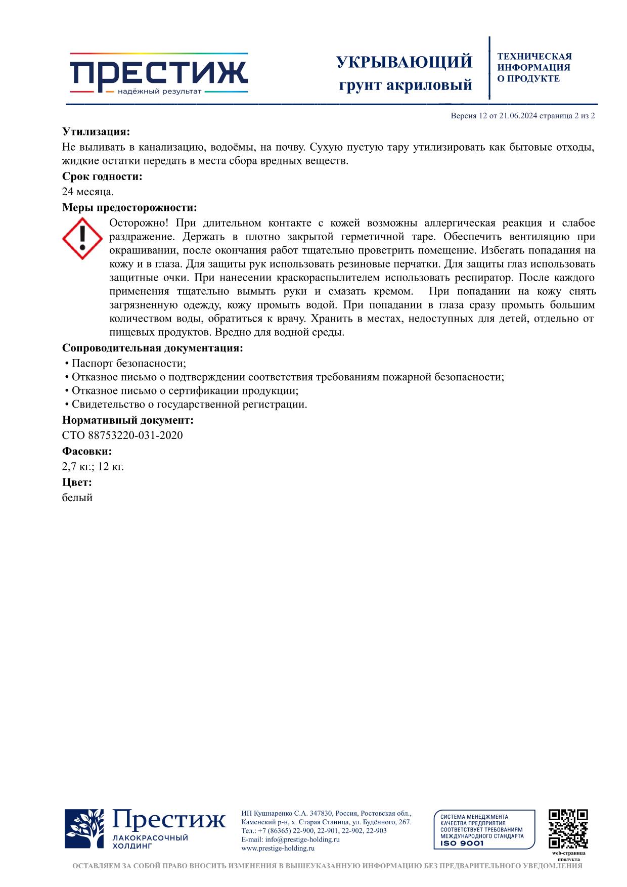 Грунт ПРЕСТИЖ укрывающий белый акриловый 2,7кг