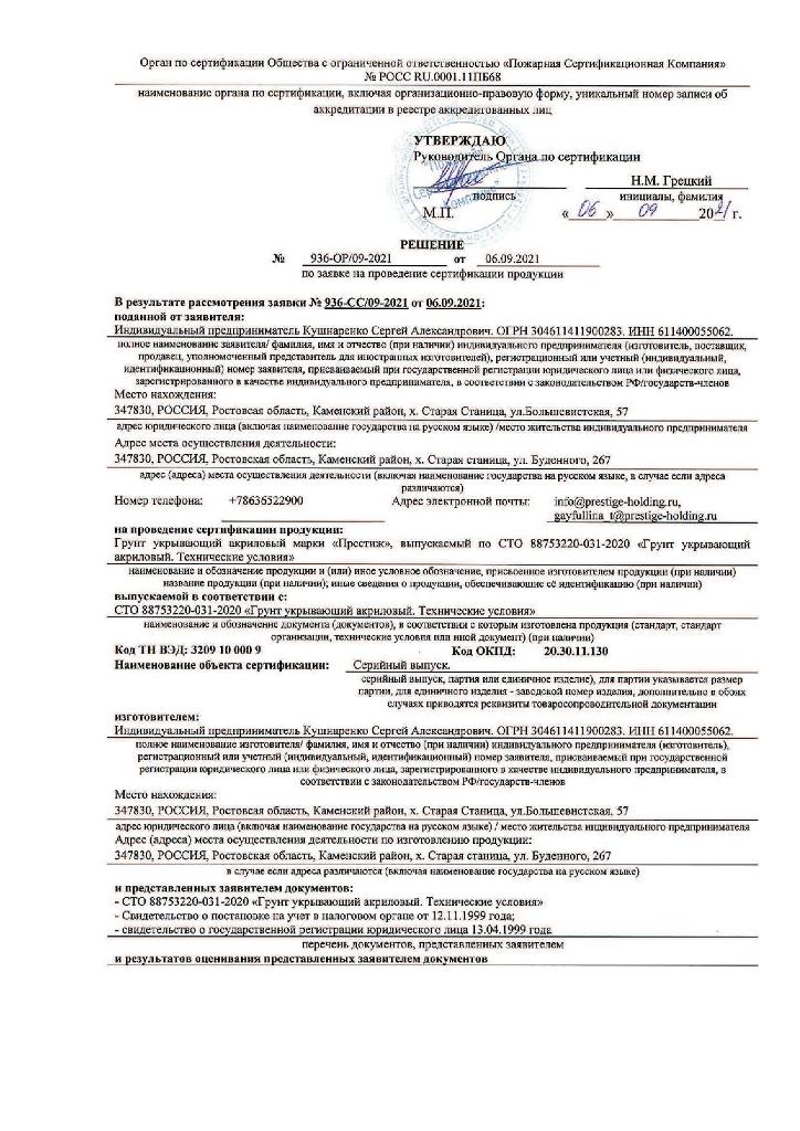Грунт укрывающий ПРЕСТИЖ белый акриловый 2,7кг