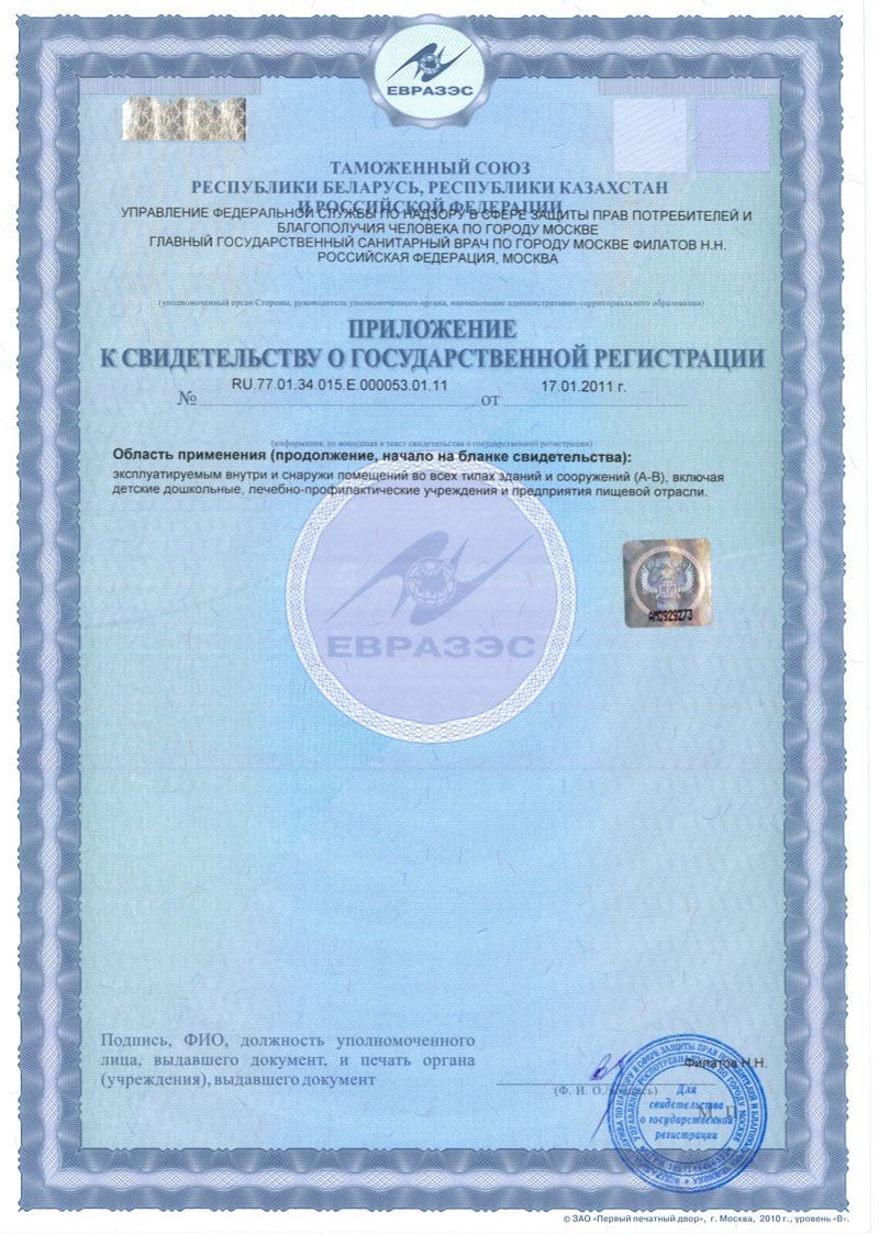Сертифицирован для применения в детских и лечебных учреждениях |
