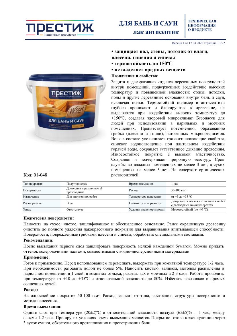 Лак ПРЕСТИЖ акриловый для бань и саун 0,9кг